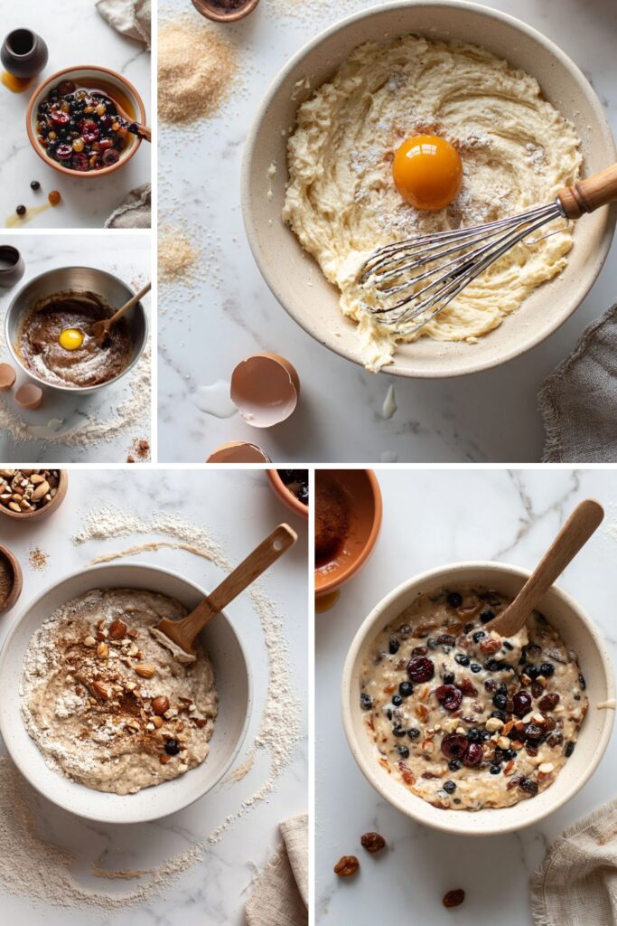 - 6. Incorporate the fruit: Stir the soaked mixed fruit and any residual brandy into the batter until evenly distributed.