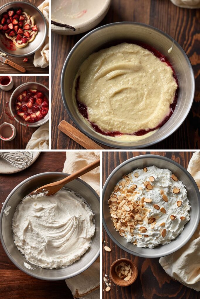 - 2. Add the fruit: Scatter the fresh strawberry halves evenly over the sponge slices.