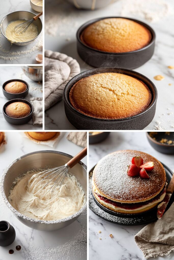 - 6. Assemble the cake: Spread the buttercream generously over the flat side of one sponge. Spread the jam on the flat side of the second sponge, then sandwich them together and dust the top with icing sugar.