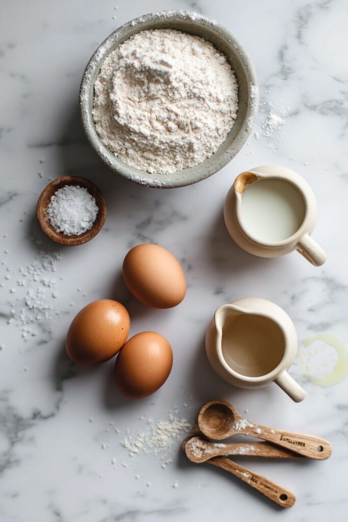 • 1. Mix the batter: Sift the flour and salt into a bowl, make a well in the centre, and whisk in the eggs until smooth.